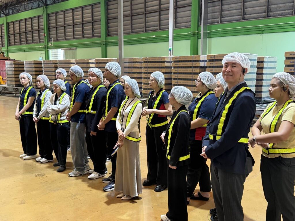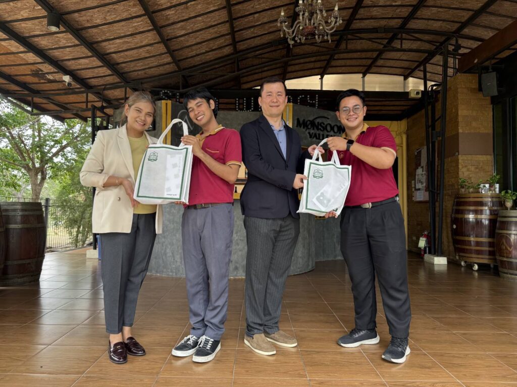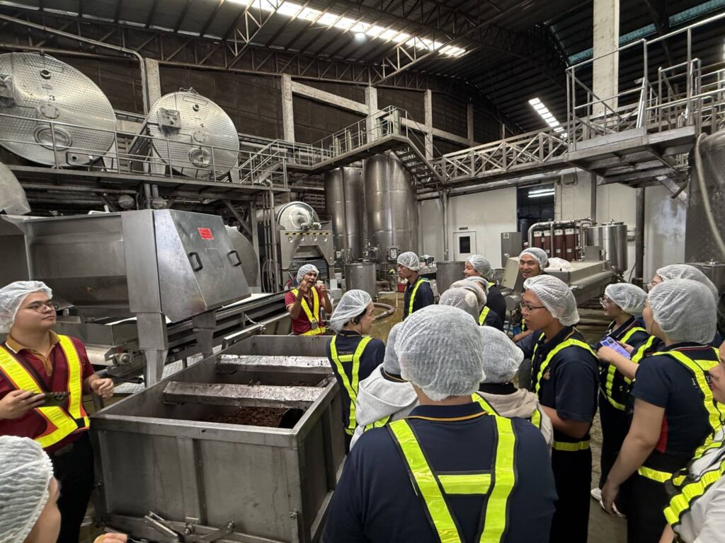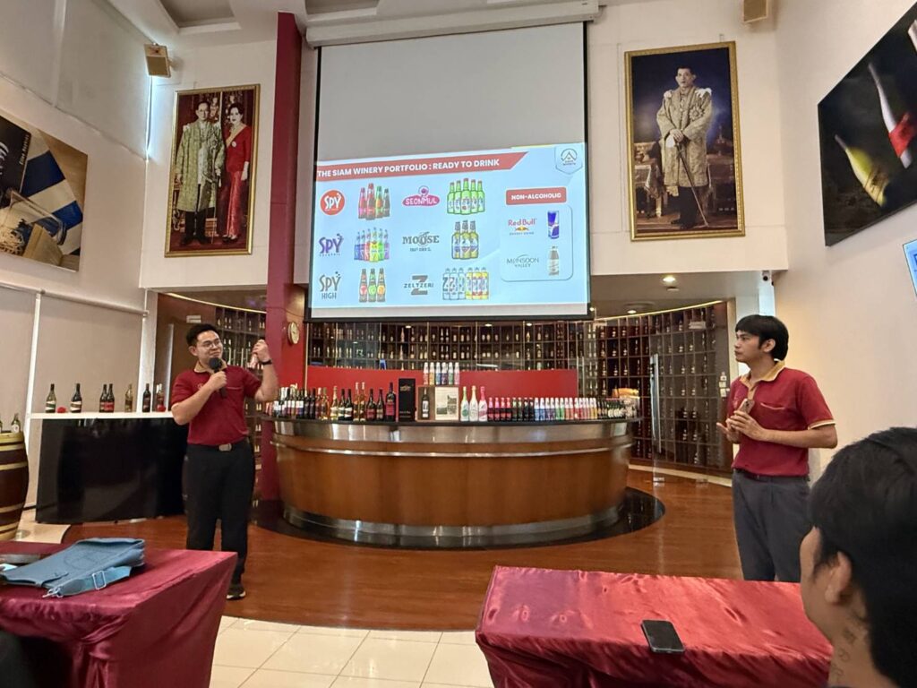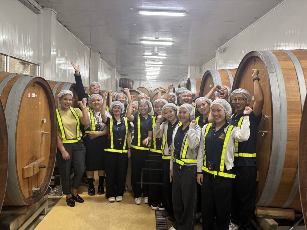 During the visit, students were introduced to Siam Winery’s journey as a pioneering Thai brand, gaining insights into how the company leverages local agricultural resources alongside global winemaking expertise. Through guided tours of the SPY Wine Cooler production line and Thai wine facilities, students experienced firsthand the integration of product innovation, branding strategy, and advanced manufacturing processes.